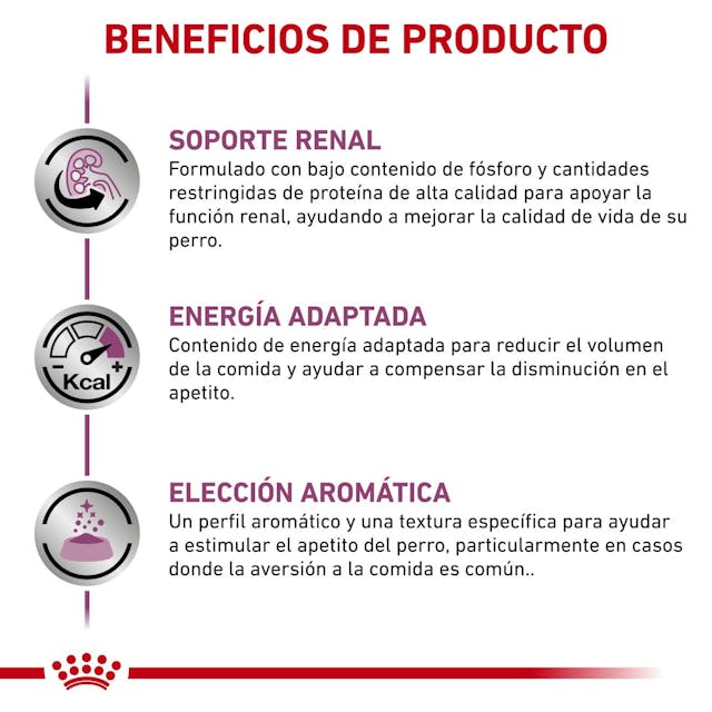 Ácidos grasos esenciales EPA y DHA, así como un complejo de antioxidantes y bajo contenido de fósforo para ayudar a retrasar el avance de la enfermedad.