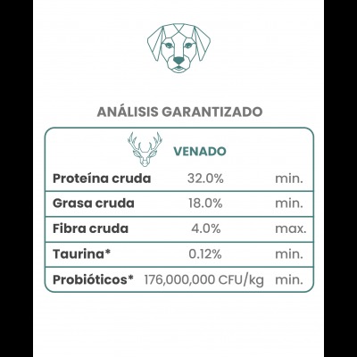 carne de venado, harina de carne de cordero, garbanzos, chicharos, lentejas, proteína de chicharos, aceite de canola, producto de huevo (gallina), harina de carne de pato, harina de chicharos, orujo de tomate, sabor natural (pollo), harina de carne de pescado, sal, cloruro de colina, taurina, raíz de achicoria seca, tomates, arándanos, frambuesas, extracto de yucca schidigera, producto de fermentación de lactobacillus plantarum secos, producto de fermentación de bacillus subtilis secos, producto de fermentación de lactobacillus acidophilus secos, producto de fermentación de enterococcus faecium secos, producto de fermentación de bifidobacterium animalis secos, suplemento de vitamina e, proteinato de hierro, proteinato de zinc, proteinato de cobre, sulfato ferroso, sulfato de zinc, sulfato de cobre, yodato de potasio, mononitrato de tiamina (vitamina b1), proteína de manganeso, óxido de manganeso, ácido ascórbico, suplemento de vitamina a, biotina, niacina, pantotenato de calcio, sulfato de manganeso, selenito de sodio, clorhidrato de piridoxina (vitamina b6), suplemento de vitamina b12, riboflavina (vitamina b2), suplemento de vitamina d, ácido fólico.