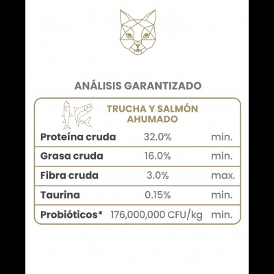Descripción de Producto: Fórmula libre de granos con trucha y salmón ahumado como proteínas principales. Ideal para gatos de todas las edades, favorece digestión, energía y pelaje brillante. Adicionada con frutas y verduras que aportan antioxidantes naturales para su sistema inmune y buena salud general. Ácidos grasos Omega-3 y Omega-6 para mantener una piel sana y un pelo hermoso.