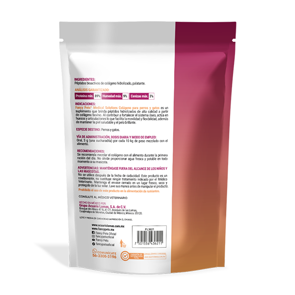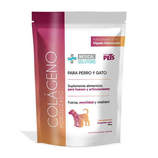 Fancy Pets® Medical Solutions Colágeno para perros y gatos es un suplemento que brinda péptidos hidrolizados de alta calidad a partir de colágeno bovino. Al contribuir a fortalecer el sistema óseo, actúa en huesos y articulaciones lo que facilita la movilidad y flexibilidad, además de mantener la piel saludable y el pelo brillante. ANÁLISIS GARANTIZADO: Proteína min. 90%, Húmedad max 9%, Cenizas max. 2%