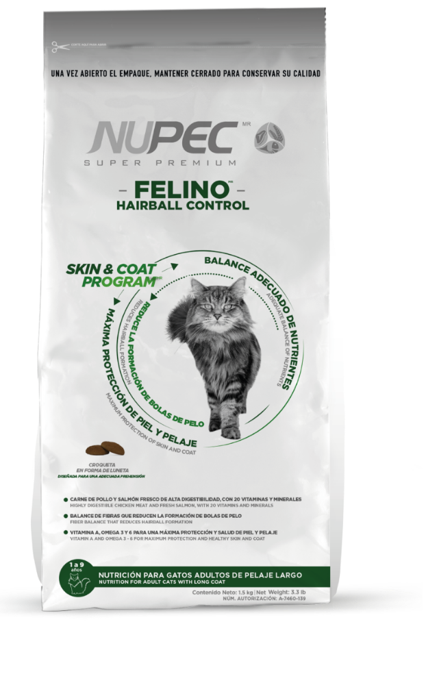 En NUPEC estamos conscientes de que el metabolismo de un felino de pelaje largo requiere de una nutrición especializada. Por ello hemos formulado un alimento con un balance adecuado de nutrientes que ayuda a reducir la formación de bolas de pelo, brindándole máxima protección de piel y pelaje.