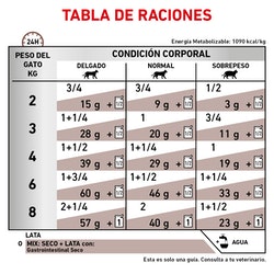 El logo S/O index garantiza que esta dieta promueve un medio ambiente urinario desfavorable a la formación de cálculos de estruvita y oxalato de calcio. Alimento húmedo para gato con transtornos gastrointestinales, diarrea aguda y crónica, enfermedad intestinal inflamatoria (EII), mala digestión, mala absorción, colitis según estado clínico, convalecencia, sobrecrecimiento bacteriano, gastritis, enteritis y colitis. ROYAL CANIN® Feline GASTROINTESTINAL loaf está formulado para satisfacer los niveles nutricionales establecidos por la AAFCO en los perfiles de nutrientes de alimentos para gatos en mantenimiento. Ingredientes : Agua suficiente para el procesamiento, subproductos de pollo (menudencias), carne de pollo, hígado de pollo, harina de maíz, harina de arroz cervecero, plasma de cerdo, aceite de pescado, celulosa en polvo, saborizante natural (ave), silicoaluminato sódico, tripolifosfato de sodio, cloruro de potasio, taurina, goma de algarrobo, carbonato de calcio, sulfato de calcio, hidrolizado de levadura de cerveza deshidratada, cloruro de colina, vitaminas [acetato DL-alfa-tocoferol (fuente de vitamina E), L-ascorbil-2-polifosfato (fuente de vitamina C), mononitrato de tiamina (vitamina B1), suplemento de niacina, biotina, D-pantotenato de calcio, suplemento de riboflavina, clorhidrato de piridoxina (vitamina B6), ácido fólico, suplemento de vitamina B12, suplemento de vitamina D3], carragenina, ácido cítrico, carbonato de sodio, oligoelementos [proteinato de zinc, óxido de zinc, sulfato ferroso, sulfato de cobre, óxido de manganeso, selenito de sodio, yodato de calcio], óxido de magnesio, extracto de cempasúchil (Tagetes erecta L.). Análisis garantizado: Proteína Cruda (mín.) 8.2%, Grasa Cruda (mín.) 4.9%, Fibra Cruda (máx.) 1.4%, Humedad (máx.) 77.4%, Ácido Eicosapentaenoico + Docosahexaenoico (EPA + DHA) (mín.) 0.07%. Contenido calórico: Este alimento contiene 1090 kcal EM/kg; 158 kcal EM/lata de alimento dada (calculada). Instrucciones de alimentación: Utilice sólo como se lo indique su veterinario. Asegúrese de que su mascota siempre tenga agua fresca disponible. Cubra y refrigere la porción no utilizada. Consulte al médico veterinario.
