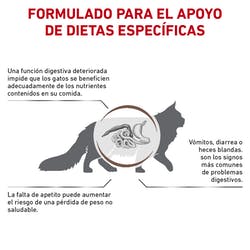 Contenido energético elevado, 12% más que Feline Gastrointestinal Moderate Calorie dry, parareducir el volumen alimenticio y la carga intestinal.