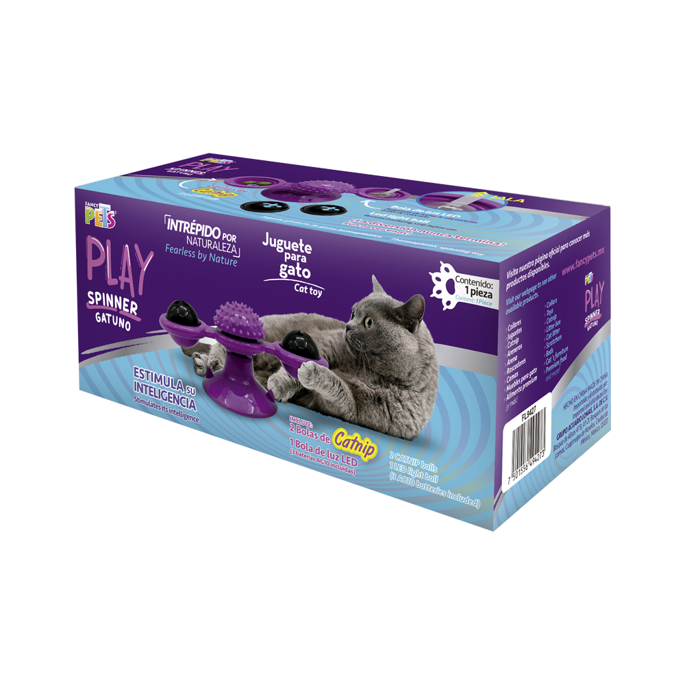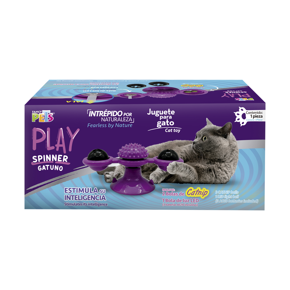 El juguete spinner gatuno con catnip para gato de la línea Play de Fancy Pets® está diseñado para estimular el instinto cazador de tu gato, con elementos que llamarán su atención como el movimiento y las luces del spinner. Promueve la salud dental.