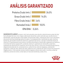 Análisis garantizado: Proteína Cruda (mín.) 24.0%, Grasa Cruda (mín.) 14.0%, Fibra Cruda (máx.) 3.6%, Humedad (máx.) 10.0%, Ácido Eicosapentaenoico + Docosahexaenoico (EPA + DHA) (mín.) 0.24%, Glucosamina* (mín.) 525 mg/kg, Sulfato de condroitina* (mín.) 8 mg/kg. *No reconocido como un nutriente esencial en el perfil de nutrientes de alimentos para perros de la AAFCO.