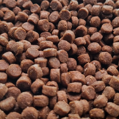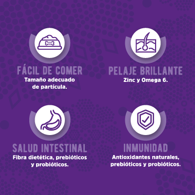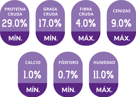 Energía Metabólica: 3,595 kcal/kg. Ingredientes: Harina de pollo, arroz, trigo, grasa de pollo como fuente de ácidos grasos Ω6, harina de carne y hueso de cerdo, avena, pulpa de remolacha y celulosa micronizada como fuentes de fibra dietética, saborizante natural de hígado de pollo o cerdo, huevo deshidratado de gallina, plasma porcino deshidratado, harina de pescado, cloruro de colina, concentrado de algas marinas, cultivos de levaduras inactivas (Saccharomyces cerevisiae y Cymberlindnera jadinii), Mananoligosacáridos, cloruro de sodio, Bacillus subtilis (≥ 400 X 1010 UFC/t) y Bacillus licheniformis (≥ 400 X 1010 UFC/t) como fuente de probióticos, antioxidantes naturales (tocoferoles, extracto de romero y concentrado de melón), Yucca schidigera, carbonato de calcio, proteinato de Manganeso, proteinato Ferroso, proteinato de Cobre, proteinato de Zinc, levadura inactiva (Saccharomyces cerevisiae) enriquecida con Selenio como fuentes de minerales orgánicos, yodato y cloruro de Potasio, vitaminas A, E, D3, K, B12, tiamina, riboflavina, ácido pantoténico, biotina, colina, niacina, piridoxina, ácido fólico.