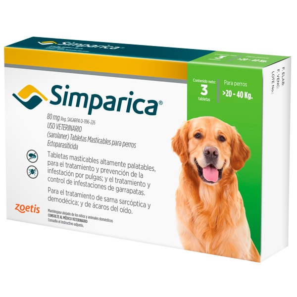Simparica® es una tableta masticable con muy buen sabor que gracias a su innovación mantiene a tu perro libre de pulgas, garrapatas y sarnas con alta eficacia durante 35 días consecutivos.