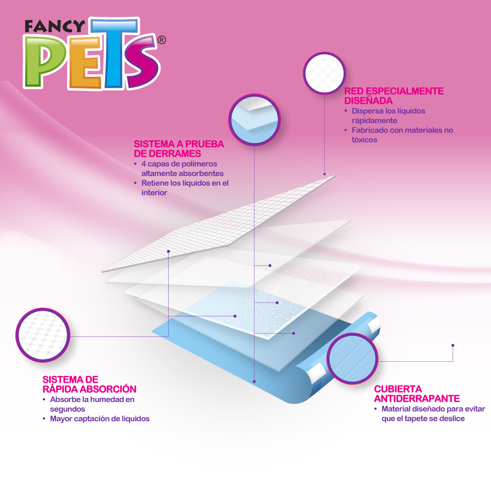 Elimina los malos olores. Ventajas: SISTEMA A PRUEBA DE DERRAMES: 4 Capas de polímeros alta absorbentes y retiene los líquidos en el interior. SISTEMA DE RAPIDO ABSORCION: Absorbe la humedad en segundos y Mayor captación de líquidos. RED ESPECIALMENTE DISEÑADA: Dispersa los líquidos rápidamente y fabricado con materiales no tóxicos. CUBIERTA ANTEDERRAPANTE: Material diseñado para evitar que el tapete se deslice.